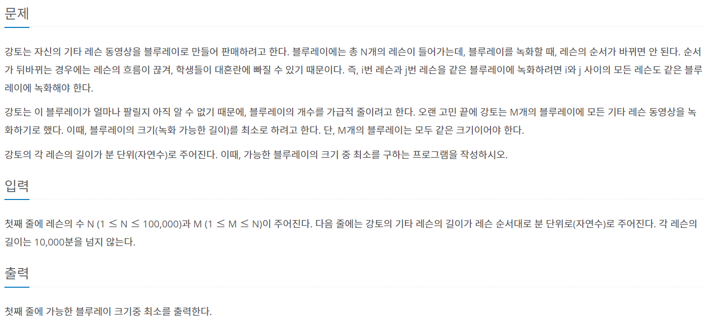 각 레슨의 길이가 저장된 배열을 차례대로 탐색하여 한 블루레이당 레슨 길이의 합이 mid보다 작도록 레슨을 그룹으로 분리한다.