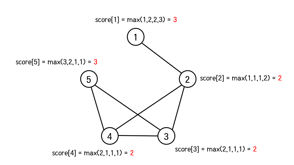 이 중에서 가장 큰 값이 1번 회원의 점수가 되므로 1번 회원의 점수는 3이 된다.