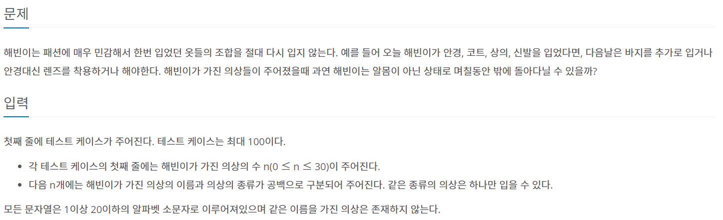 그러므로 (각 종류별로 옷의 개수 + 1)를 모두 곱한 다음에 마지막에 알몸인 경우 한가지를 뺀다.