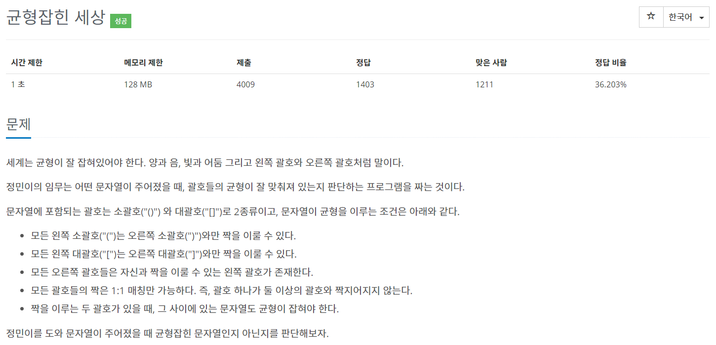 스택이 비어있지 않으면 균형잡힌 문자열이 아니다.