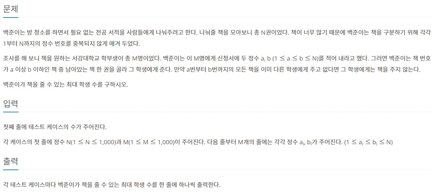 나는 우선순위 큐를 사용하여 b가 작을수록 우선순위가 높고, b가 같으면 a가 클수록 우선순위가 높도록 설정한 뒤, 우선순위 큐에서 범위 (a,b)를 하나씩 꺼내었다.