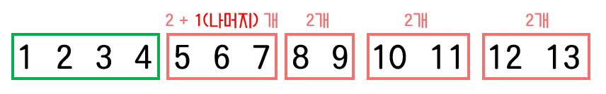 그리고 나머지가 존재하면, 묶음당 하나씩 나머지를 배분한다.