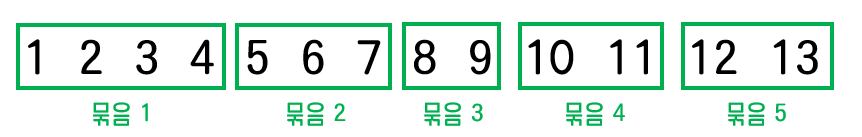 5 6 7 8 9 10 11 12 13 을 4개의 묶음으로 나누려면 하나의 묶음당 적어도 들어가는 수의 개수는?