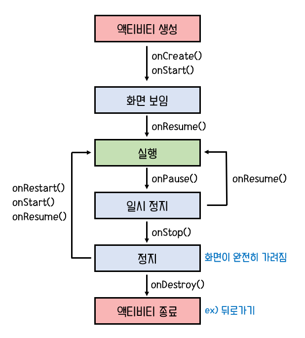 액티비티가 실행되면 onCreate() 다음에 onStart()가 호출된다.onCreate() -> onStart()