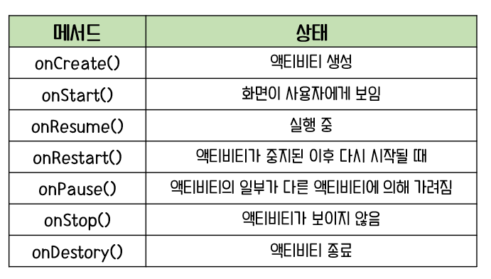 사용자가 호출하는 것이 아니라 상태 변화에 따라 안드로이드가 자동으로 호출해주기 때문에 콜백 메소드이다.