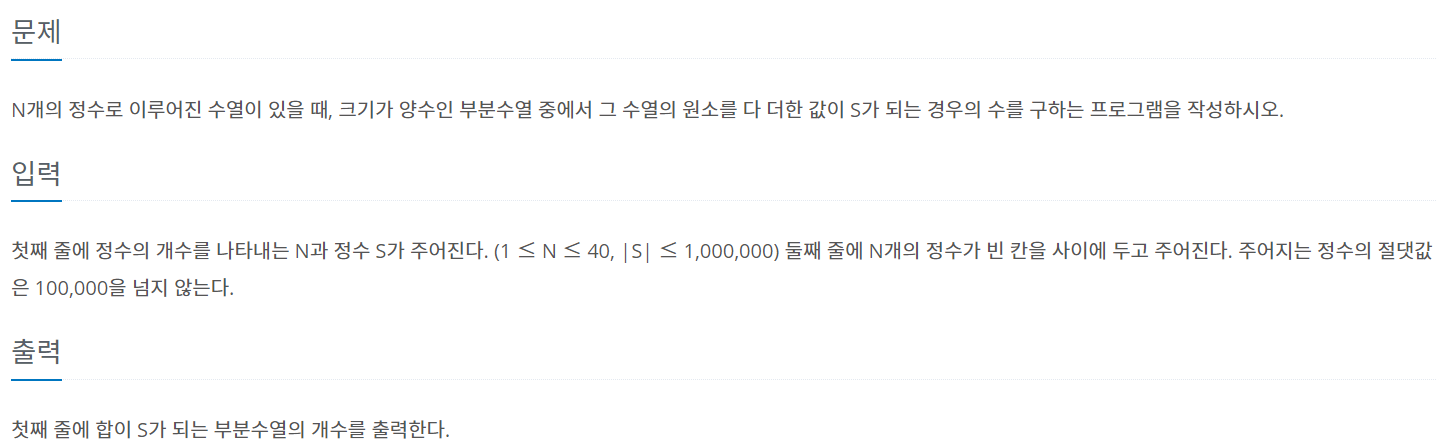 첫째 줄에 정수의 개수를 나타내는 N과 정수 S가 주어진다. (1 ≤ N ≤ 40, |S| ≤ 1,000,000) 둘째 줄에 N개의 정수가 빈 칸을 사이에 두고 주어진다. 주어지는 정수의 절댓값은 100,000을 넘지 않는다.