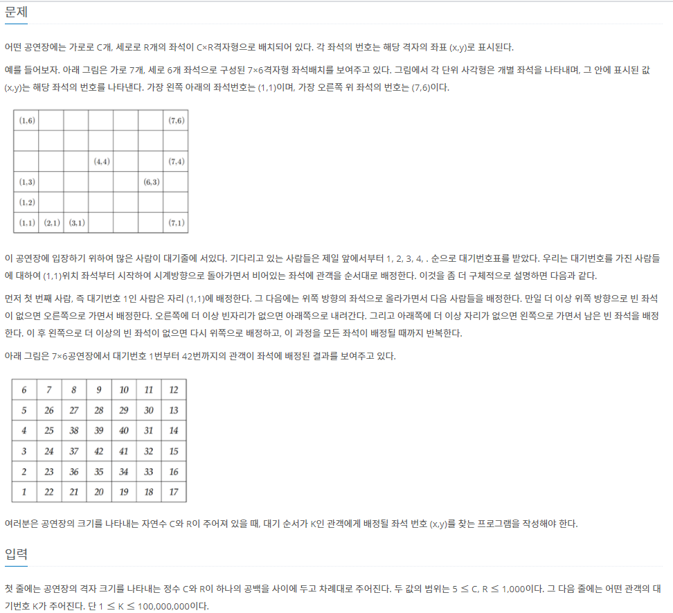 첫 줄에는 공연장의 격자 크기를 나타내는 정수 C와 R이 하나의 공백을 사이에 두고 차례대로 주어진다. 두 값의 범위는 5 ≤ C, R ≤ 1,000이다. 그 다음 줄에는 어떤 관객의 대기번호 K가 주어진다.