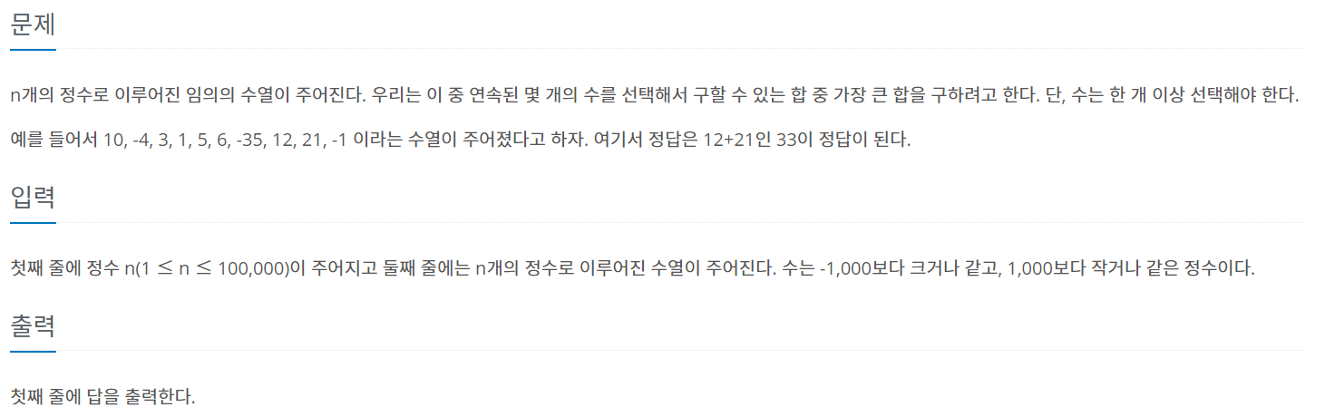 dp[0]부터 dp[n-1]까지 모두 구하고 난 후, 이들 중 가장 큰 값이 연속합의 최대값이 된다.