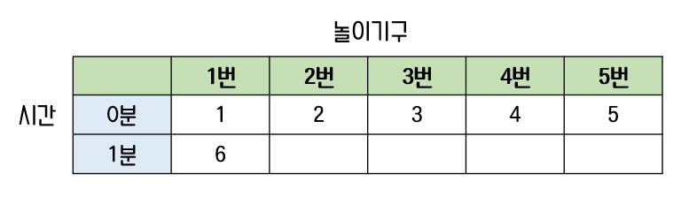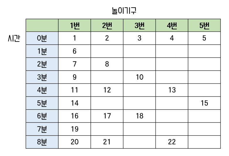 이와 같은 방법으로 1분이 지날 때마다 놀이기구에 탑승하는 아이들을 표로 나타내면 아래와 같다.