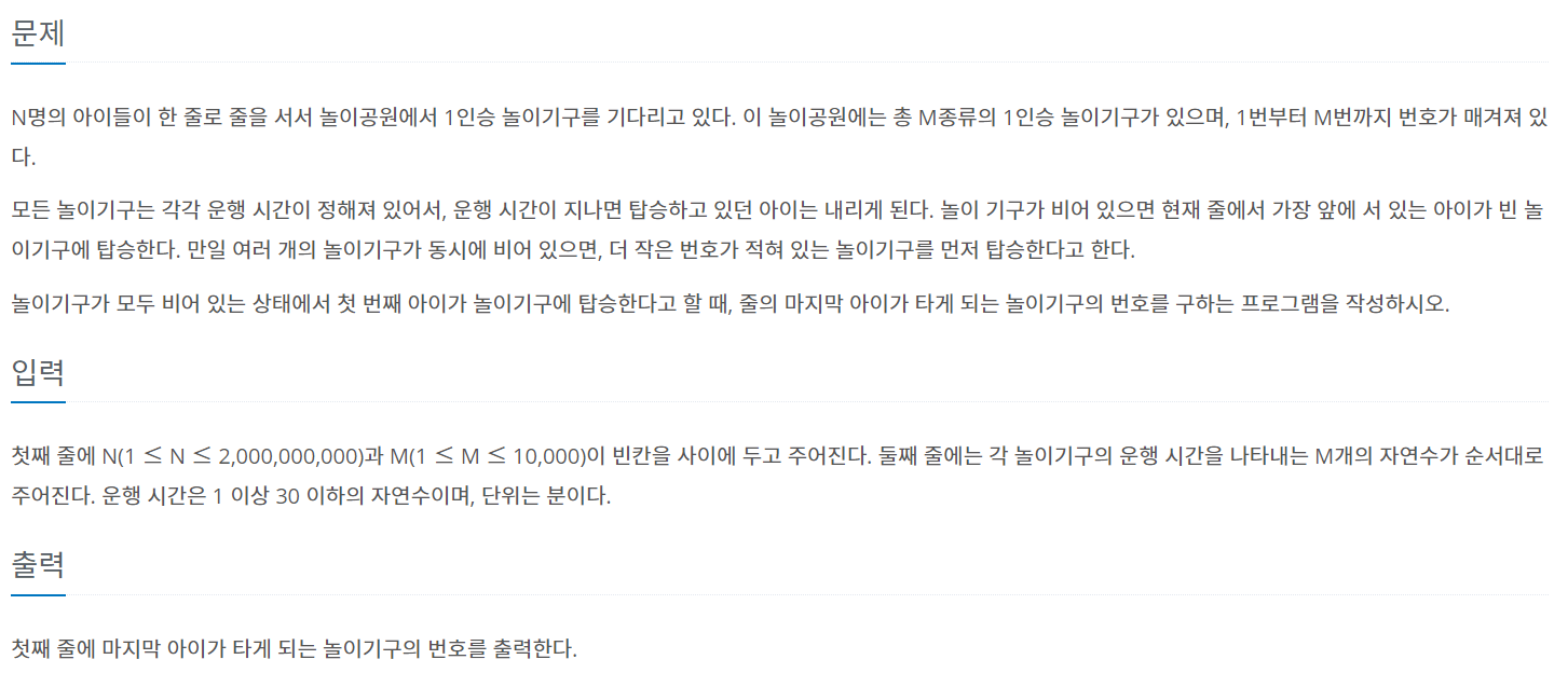 이 문제는 이분탐색으로 모든 아이들이 다 놀이기구를 탈 수 있는 최소 시간을 구하여 풀 수 있다.