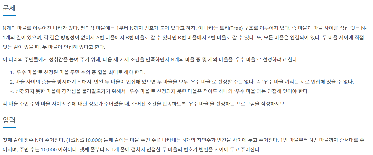 - dp[n][1] : n번 마을이 우수 마을일 때, n번 마을을 루트노드로 하는 하위트리의 마을 주민 수의 총합