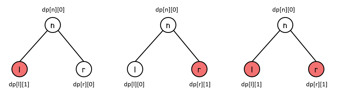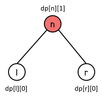 트리의 아래에서 위로 올라오면서 계속 dp[n][0]와 dp[n][1]을 구한다.