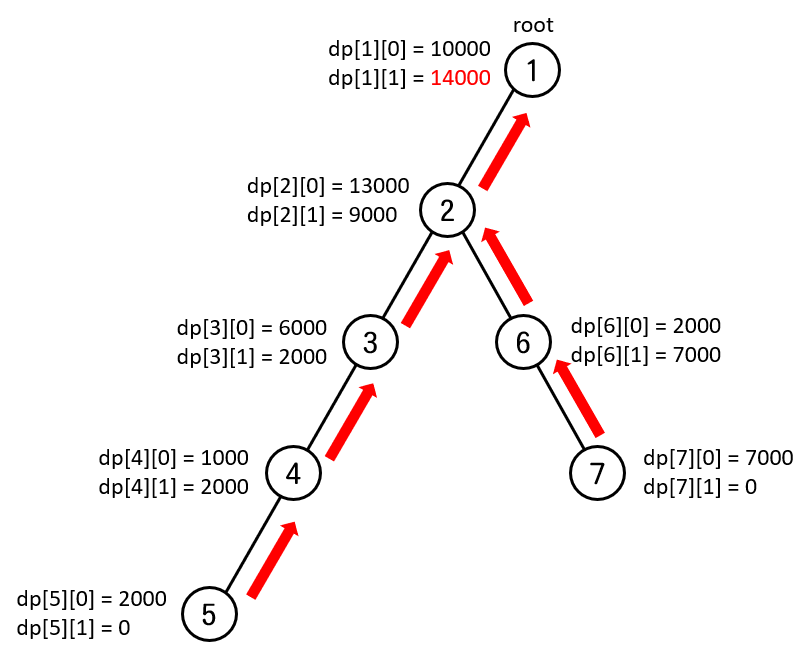 루트노드까지 올라오고 나면, 각각의 마을마다 다음과 같은 dp배열 정보를 갖는다.