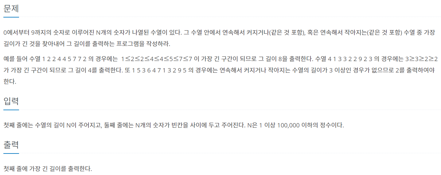 0에서부터 9까지의 숫자로 이루어진 N개의 숫자가 나열된 수열이 있다. 그 수열 안에서 연속해서 커지거나(같은 것 포함), 혹은 연속해서 작아지는(같은 것 포함) 수열 중 가장 길이가 긴 것을 찾