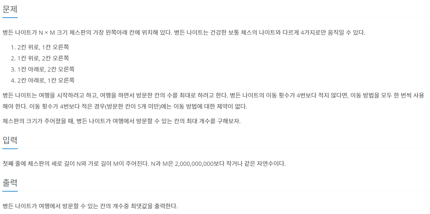 1783번: 병든 나이트 첫째 줄에 체스판의 세로 길이 N와 가로 길이 M이 주어진다. N과 M은 2,000,000,000보다 작거나 같은 자연수이다. www.acmicpc.net 막상 문제를 풀고 나니 허무할 정도로 간단한데, 규칙을 찾는데까지 너무 오랜 시간이 걸렸다.. 이 문제는 케이스를 나누어서 각 케이스 별로 방문한 칸을 구하는 것이 중요하다. 먼저, 나이트가 이동할 수 있는 위치는 다음과 같다. 문제에서 조건이 주어지는데, 4번 이상 움직일 때는 4가지 방법으로 모두 움직여야 하지만, 3번까지 움직일 때는 4가지 방법을 모두 사용하여 움직일 필요가 없다는 점이다. 3번 이동할 때까지는 똑같은 방법으로만 움질이는 것도 가능하다. 나이트가 아예 움직일수 없는 경우 ( N = 1 || M = 1 )..