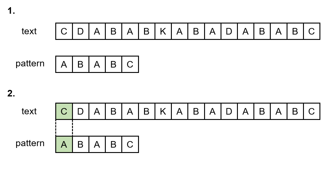 어떤 문자열(T)에서 특정 문자열(P)를 찾을 때 사용하는 알고리즘 예를 들어, 문자열(T) : "CDABABKABADABABC" 문자열(P) : "ABABC" 문자열 T에서 문자열 P를 찾는 방법을 단순하게 완전탐색으로 구현해보면 이중 for문을 통해 다음과 같이 구현해 볼 수 있다. String T="CDABABKABADABABC" String P="ABABC" for(int i=0;i pattern과 pattern의 비교 text와 pattern을 비교한 것과 마찬가지로 pattern과 pattern의 비교도 비슷한 방식으로 이루어진다. 따라서 pattern과 pattern을 비교하는 알고리즘을 이해하고 나면, text와 pattern을 비교하는 알고리즘도 이해하기가 쉬울 것이다. 우선 건너뛰기 표..