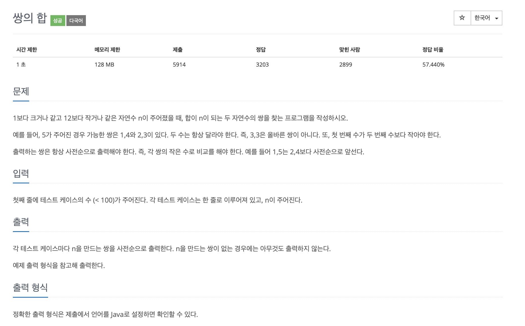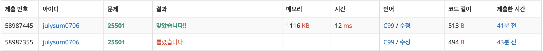 난이도 '하' 수준의 쉬운 문제이다. 자연수 n이 주어졌을 때, n이 짝수인지 홀수인지에 따라서 반복문 조건식에 들어가는 수 m을 다르게 한다. n이 짝수이면(예를 들어 6) 6을 2로 나눈 몫 3은 for문에 포함시키지 않는다. n이 홀수이면(예를 들어 5) 5를 2로 나눈 몫 2는 for문에 포함시킨다. 변수 m은 삼항연산자를 이용하여 정의하였다. -> m = (n%2 == 0 ? n/2 : n/2+1); #include int main(void){ int t,n; scanf("%d",&t); for(int i=0;i