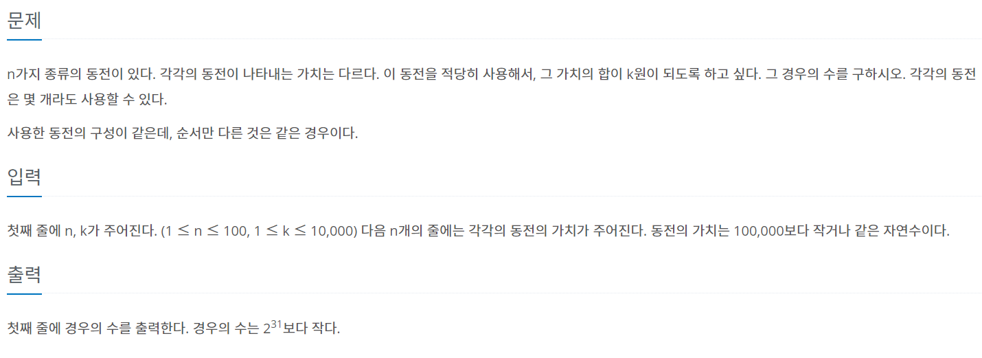 2293번: 동전 1 첫째 줄에 n, k가 주어진다. (1 ≤ n ≤ 100, 1 ≤ k ≤ 10,000) 다음 n개의 줄에는 각각의 동전의 가치가 주어진다. 동전의 가치는 100,000보다 작거나 같은 자연수이다. www.acmicpc.net 합이 k원이 되면서, 순서만 다르고 조합이 같은 경우는 하나의 경우로 여긴다. 우선 각각의 동전의 가치를 coin 배열을 생성하여 차례대로 넣어주었다. int[] coin = new int[n]; coin[0] = 1 coin[1] = 2 coin[2] = 5 이 문제를 다이나믹 프로그래밍으로 풀기 위해 점화식을 세웠다. 처음에는 합이 k원이 되는 조합을 dp[k]라고 할 때, dp[k] = dp[k-coin[0]] + dp[k-coin[1]] + dp[k-coi..