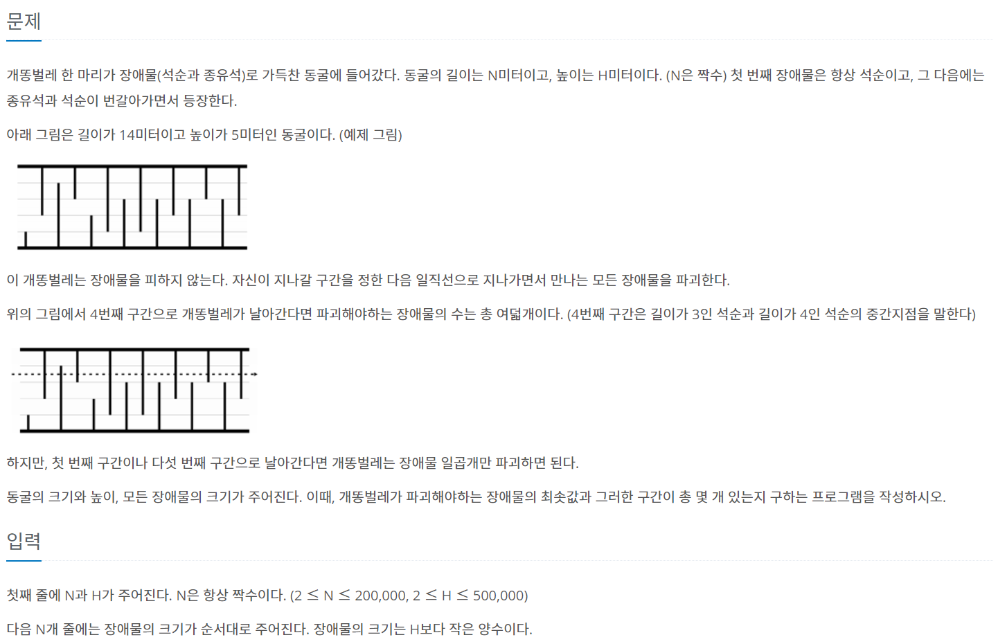 3020번: 개똥벌레 개똥벌레 한 마리가 장애물(석순과 종유석)로 가득찬 동굴에 들어갔다. 동굴의 길이는 N미터이고, 높이는 H미터이다. (N은 짝수) 첫 번째 장애물은 항상 석순이고, 그 다음에는 종유석과 석순이 www.acmicpc.net 누적합으로 문제를 해결하였다. 각각의 높이에 따라 석순과 종유석의 개수를 카운트하는 두 개의 배열 bot, top을 생성하였다. 예를 들어, 첫 번째 구간에서는 석순이 7개 존재하므로 bot[1] = 7 이 된다. 두 번째 구간에는 석순이 6개 존재하므로 bot[2] = 6 세 번째 구간에는 석순이 5개 존재하므로 bot[3] = 5 네 번째 구간에는 석순이 1개 존재하므로 bot[4] = 1 다섯 번째 구간에는 석순이 0개 존재하므로 bot[5] = 0 첫 번째 ..