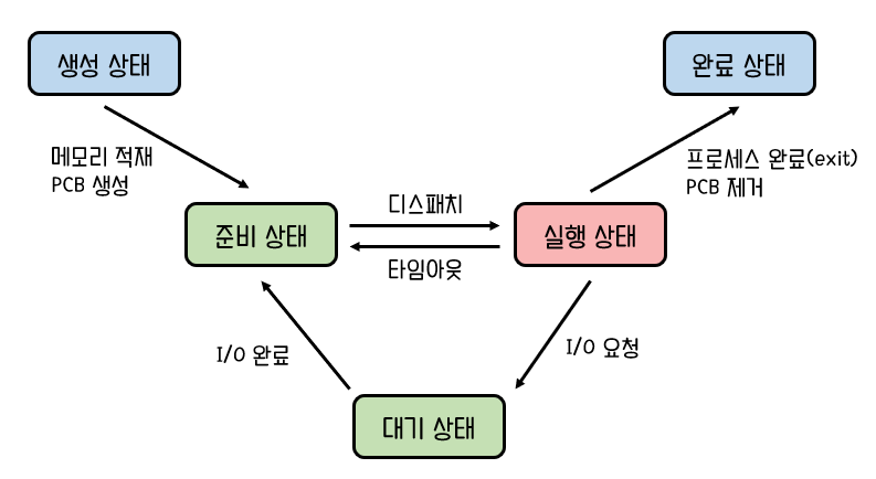 시분할 시스템이 생겨나면서 기존의 일괄 작업 시스템보다 프로세스의 상태가 복잡해졌다. 기존의 일괄 작업 시스템과 달리 시분할 시스템에서는 프로세스의 작업 도중에 인터럽트에 의해 CPU를 다른 프로세스에 넘겨주는 경우가 생겨났기 때문이다. 기본적으로 프로세스의 상태는 생성, 준비, 실행, 대기, 완료 (+보류) 5가지로 분류할 수 있다. 생성 상태 프로그램이 메모리에 올라가 프로세스가 되고, 운영체제에 의해 프로세스 제어 블럭(PCB)가 생성된다. 준비 상태 프로세스가 생성되면 바로 CPU에 할당되어 실행되는 것이 아니라 준비 상태에 접어든다. 이 때 PCB는 준비 큐에 들어가며 CPU에 할당될 때까지 자신의 차례를 기다린다. 준비 큐에서 어떤 프로세스가 실행 상태로 옮겨지는가는 CPU 스케줄러에 의해 관..