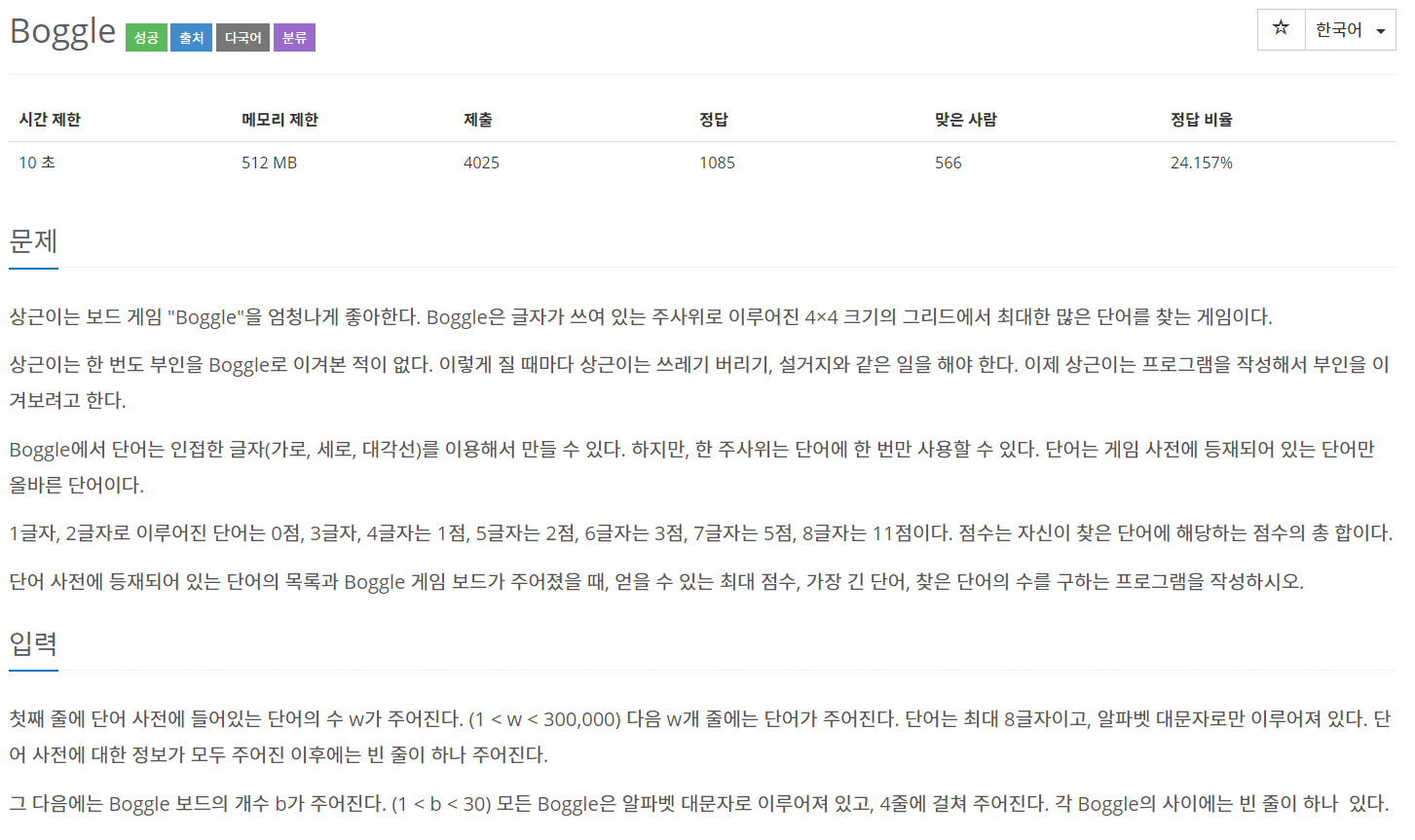 9202번: Boggle 각각의 Boggle에 대해, 얻을 수 있는 최대 점수, 가장 긴 단어, 찾은 단어의 개수를 출력한다. 한 Boggle에서 같은 단어를 여러 번 찾은 경우에는 한 번만 찾은 것으로 센다. 가장 긴 단어가 여러 개 www.acmicpc.net DFS와 트라이 알고리즘을 통해 문제를 해결하였다. 게임 사전에 등재된 단어들을 트라이에 넣는다. 각 보드마다 DFS방식으로 접근하면서 여태까지 지나온 알파벳들로 이루어진 단어가 트라이에 포함되어 있는지를 확인한다. 문제에서 같은 단어를 여러 번 찾은 경우는 하나로 간주한다고 했으므로 중복을 피하기 위해 찾은 단어를 HashSet에 넣어주었다. 기존의 트라이의 contains() 메서드는 true 혹은 false를 반환하였다.특정 단어에 트라이..
